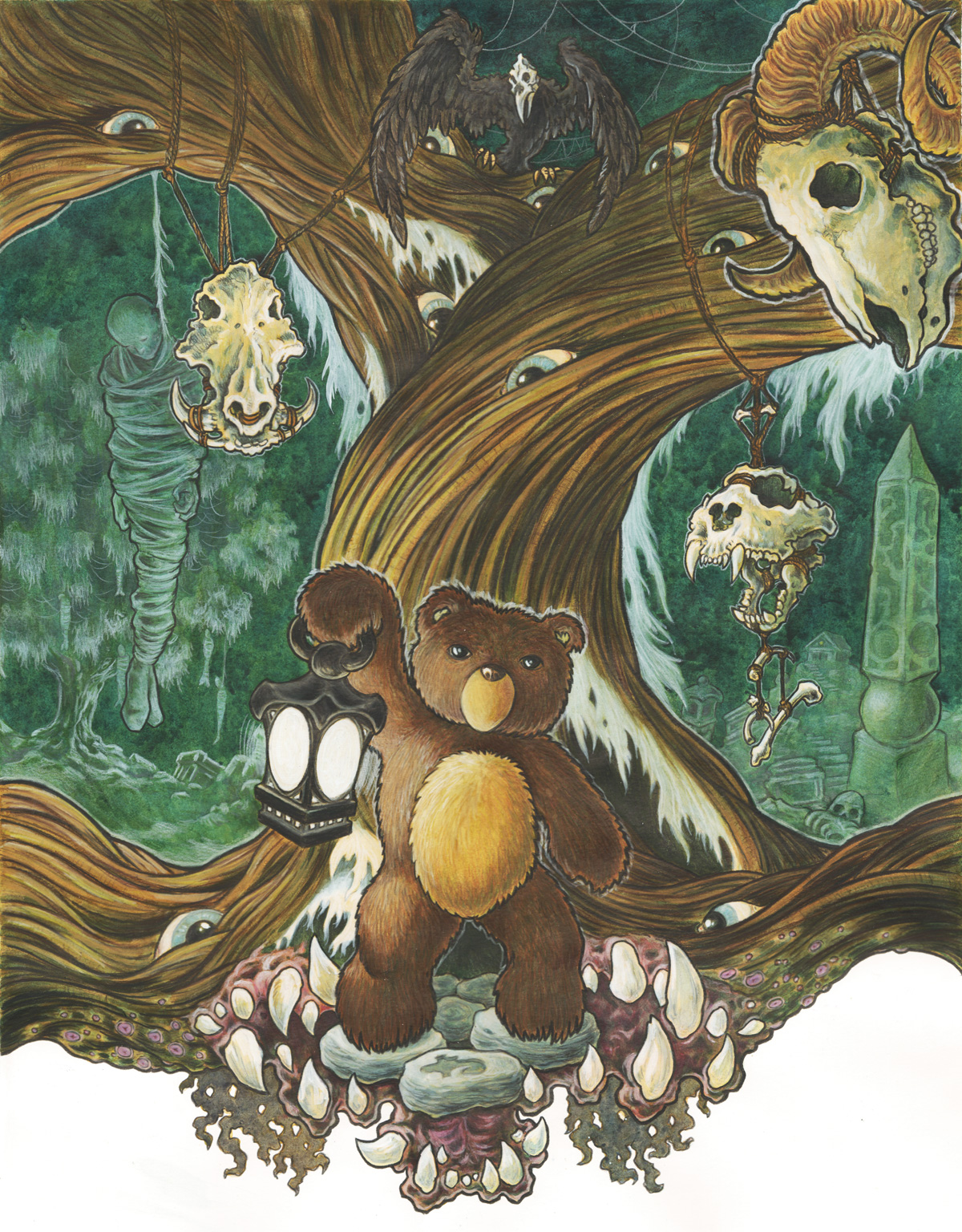 I wanted to put up some work-in-progress shots that would show a bit of what my process looks like from start to finish. This first is the finished pencil work that I transfer to bristol board after several sketches that establish composition and detail. The piece itself was a pretty important one for me as I knew it was going to be blown up into a large banner for shows. I wanted to make sure that it gave a decent summation of my artistic interests as well so I incorporated several of the subjects that I go back to repeatedly in my art, namely trees, eyes, bones and teeth. The full size drawing measures 19″x24″. Tomorrow I’ll post the image finished with traditional media.