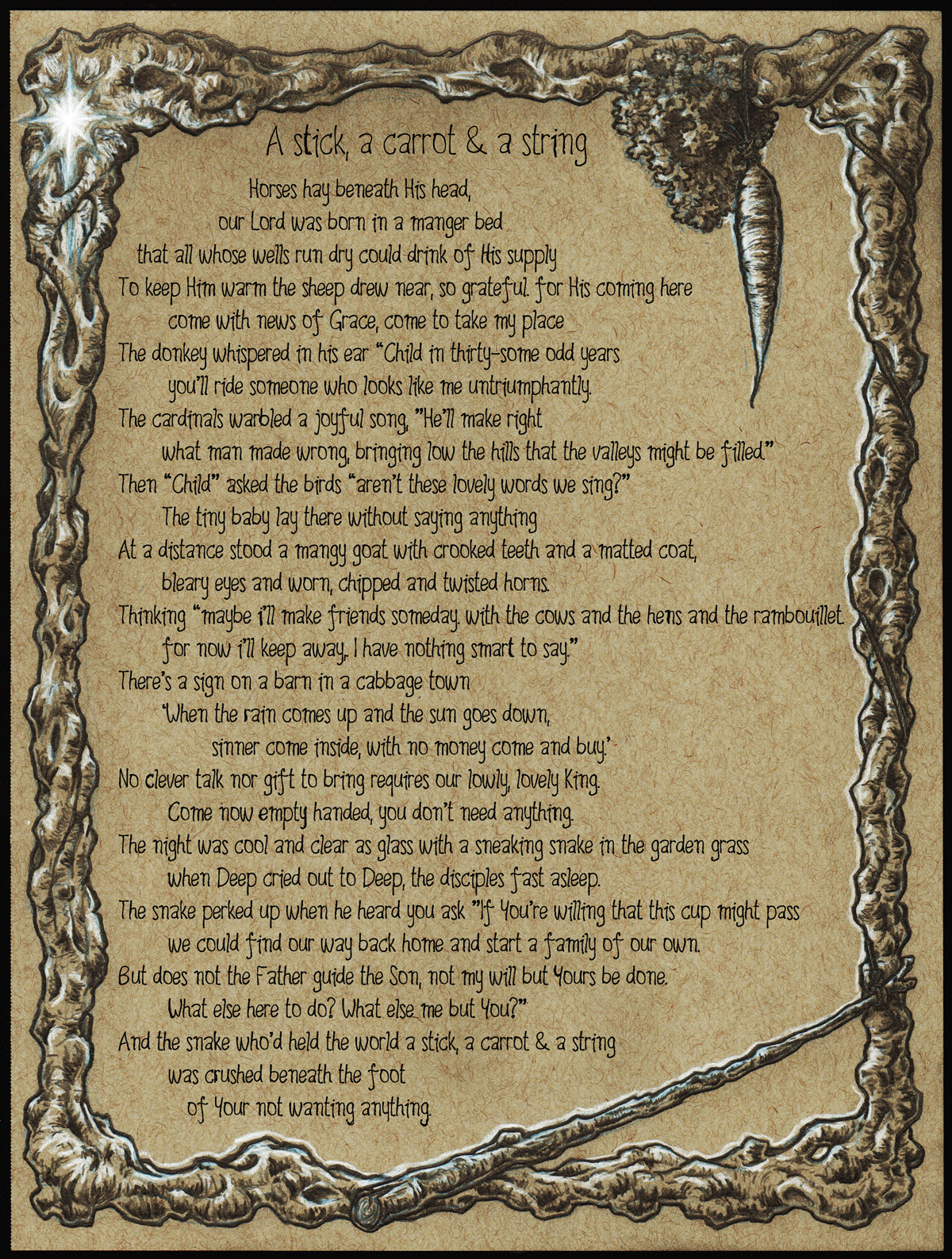 This year’s Christmas art feature’s the lyrics of a Me Without You song called “A stick, a carrot & a string”. I like it a great deal (otherwise I wouldn’t have chosen it for my holiday post) although I had never heard their version of it until recently. I first heard it from the Dustin Kensrue cover and since that is still my preferred rendition here is a link to his: https://www.youtube.com/watch?v=q-MIcKWowS4